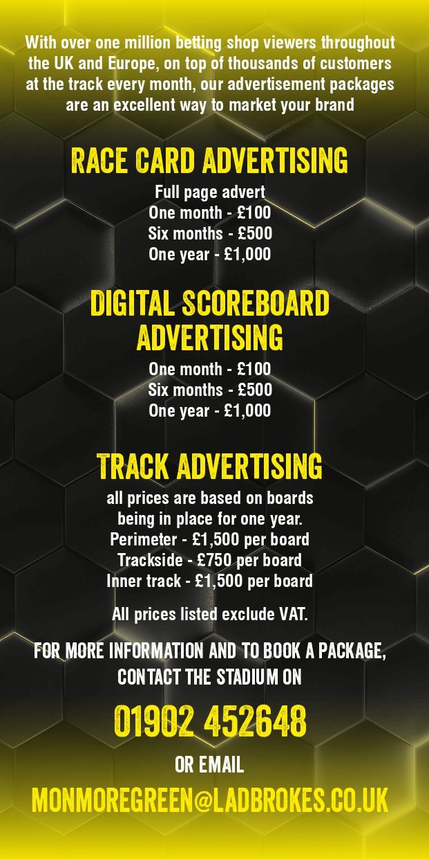 Advertising at Ladbrokes’ Monmore Green Stadium is a great way to promote your company or product to millions of people from all walks of life.